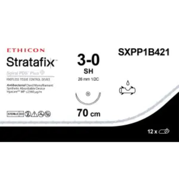 \n\nDe STRATAFIX™ Spiral PDS Plus hechtdraad is een innovatief hechtmateriaal ontworpen voor medische professionals. Deze hechtdraad zorgt voor optimale wondsluiting met minder spanning en is een betrouwbare keuze in chirurgische procedures. Verkrijgbaar in verschillende varianten, biedt het product flexibiliteit en gebruiksgemak, wat bijdraagt aan een efficiënter hechtproces.\n\nBelangrijkste kenmerken\n\nHechtdraaddetails\n\n- Hechtdraadgrootte: 4-0\n- Kleur: Violet, voor goede zichtbaarheid tijdens gebruik\n- Verkrijgbare lengtes: 70 cm en 45 cm\n- Hoeveelheid per doos: 12 stuks\n- Pledget: Niet van toepassing\n\nNaalddetails\n\n- Naaldtype: Beschikbaar in PS-2 en SH varianten\n- Naaldcode: PS-2 (SXPP1B114), SH (SXPP1B426)\n- Ontworpen voor precisie en duurzaamheid\n\nMateriaal en technologie\n\nDe STRATAFIX™ Spiral PDS Plus hechtdraad is vervaardigd met behulp van geavanceerde PDS-technologie, wat bijdraagt aan de sterkte en duurzaamheid van het product. De spiraalvorm van de hechtdraad zorgt voor gelijkmatige verdeling van spanning, wat het risico op weefselschade minimaliseert en het genezingsproces bevordert.\n\nToepassingen\n\nDe STRATAFIX™ Spiral PDS Plus hechtdraad is geschikt voor een breed scala aan chirurgische ingrepen waarbij consistente en betrouwbare hechting vereist is. Het product wordt vaak gebruikt in onder andere:\n\n- Algemene chirurgie\n- Gynaecologische procedures\n- Orthopedische ingrepen\n- Plastische en reconstructieve chirurgie\n\nSamenvatting\n\nDe STRATAFIX™ Spiral PDS Plus hechtdraad biedt een innovatieve oplossing voor de moderne chirurg. Met zijn unieke spiraalvorm en hoogwaardige materialen, biedt het product niet alleen gemak en precisie tijdens de procedure, maar ook optimale resultaten voor de patiënt. Deze hechtdraad is een waardevolle toevoeging aan de instrumenten van elke chirurg.